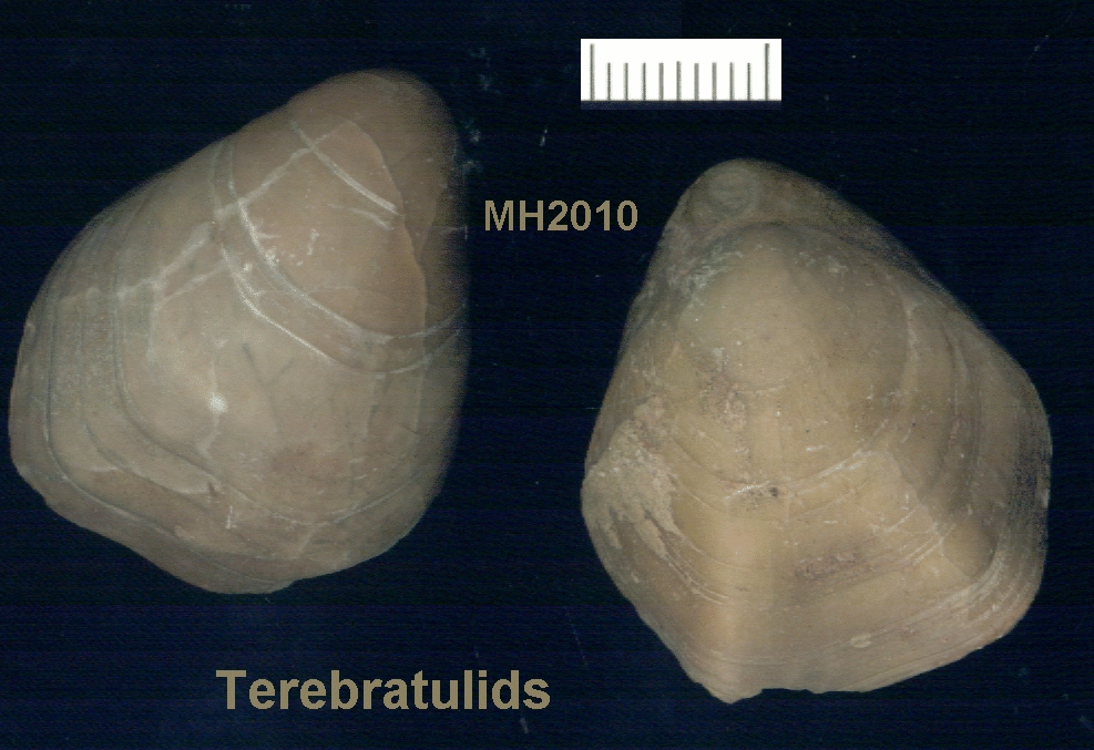 Brachiopods - lamp shells. These are common at certain levels in the Chalk. There are smooth shelled Terebratulids and ribbed Rhynchonellids.