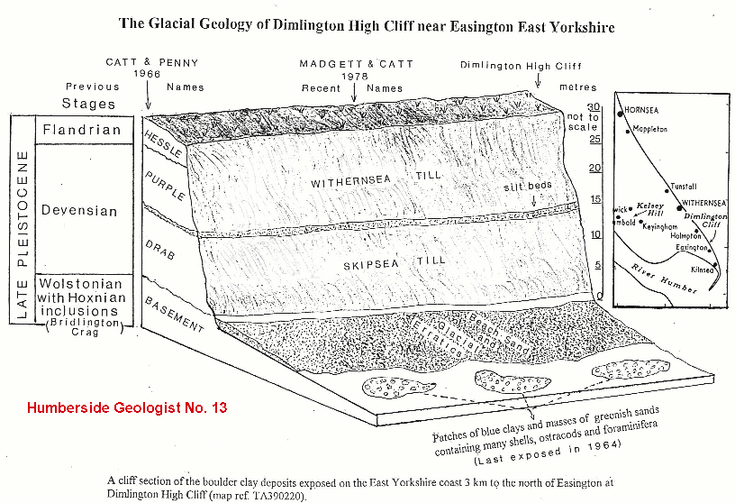 The sequence of cliff and beach exposures from Easington (map ref TA400193) to Dimlington High Cliff (map ref TA390220) on the Holderness Coast of East Yorkshire extends for approximately 3 km exhibiting an excellent section of glacial deposits, which include in ascending order the Basement Beds with erratic inclusions of blue clays and yellowish compacted sands [Bridlington Crag], overlain by Drab Till [now Skipsea Till], capped by Purple and Hessle Tills [now Withernsea Till] (see Madgett and Catt 1978).