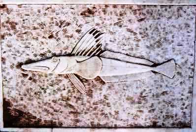 The umbers burnt into the decking of Victoria Pier are the only fish without geological interest, but nearby in Nelson Street is a large ray carved into blue bricks from Staffordshire and on the raised area near the pier is a turbot carved into polished and etched grey granite.