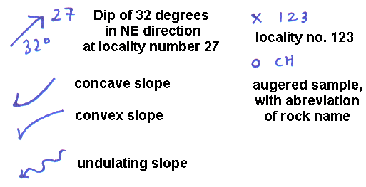 When you have an exposure then show the dip with an arrow pointing in the direction of the dip and the dip in degrees written beside it. The head of the arrow should be on the place that you measures the dip and the locality number should be beside it.