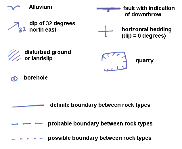 The final geological map - This is a map that presents the results of you field mapping and it is best to to a tracing based on you good copy of the map, showing the geology, exposure details, some landmarks, major roads and topography. It should not be cluttered with too much detail but anyone using should be able to find their way around it. You do not need to include all locations and location numbers, you should identify them by their grid reference in your report.