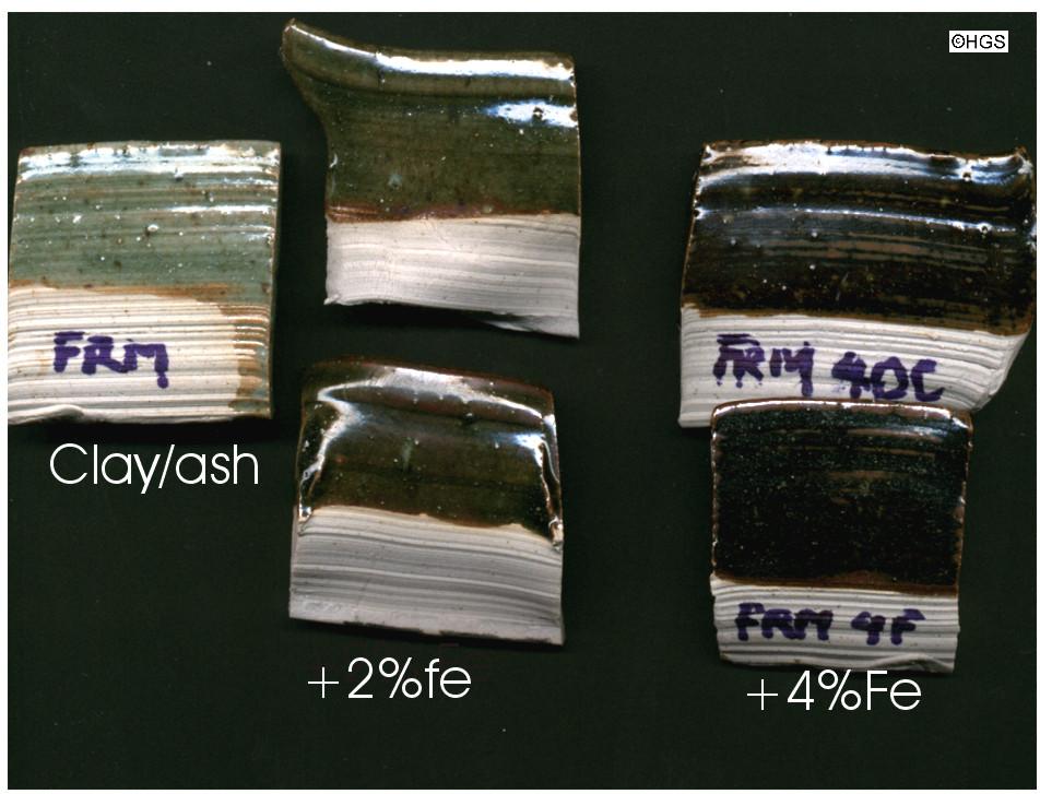 The second illustration shows one of that series derived from Fremington Clay. The pure glaze is richer, with a light grey green and a tinge of yellow. The speckles are probably derived from iron and/or manganese in both the ash and the clay. The series shows how the addition of iron to the glaze moves it into an olive green celadon colour (2% added, probably 4% total including the iron in the ash and the clay). The addition of 4% iron turns it into a dark brown to black tenmoku glaze colour.
