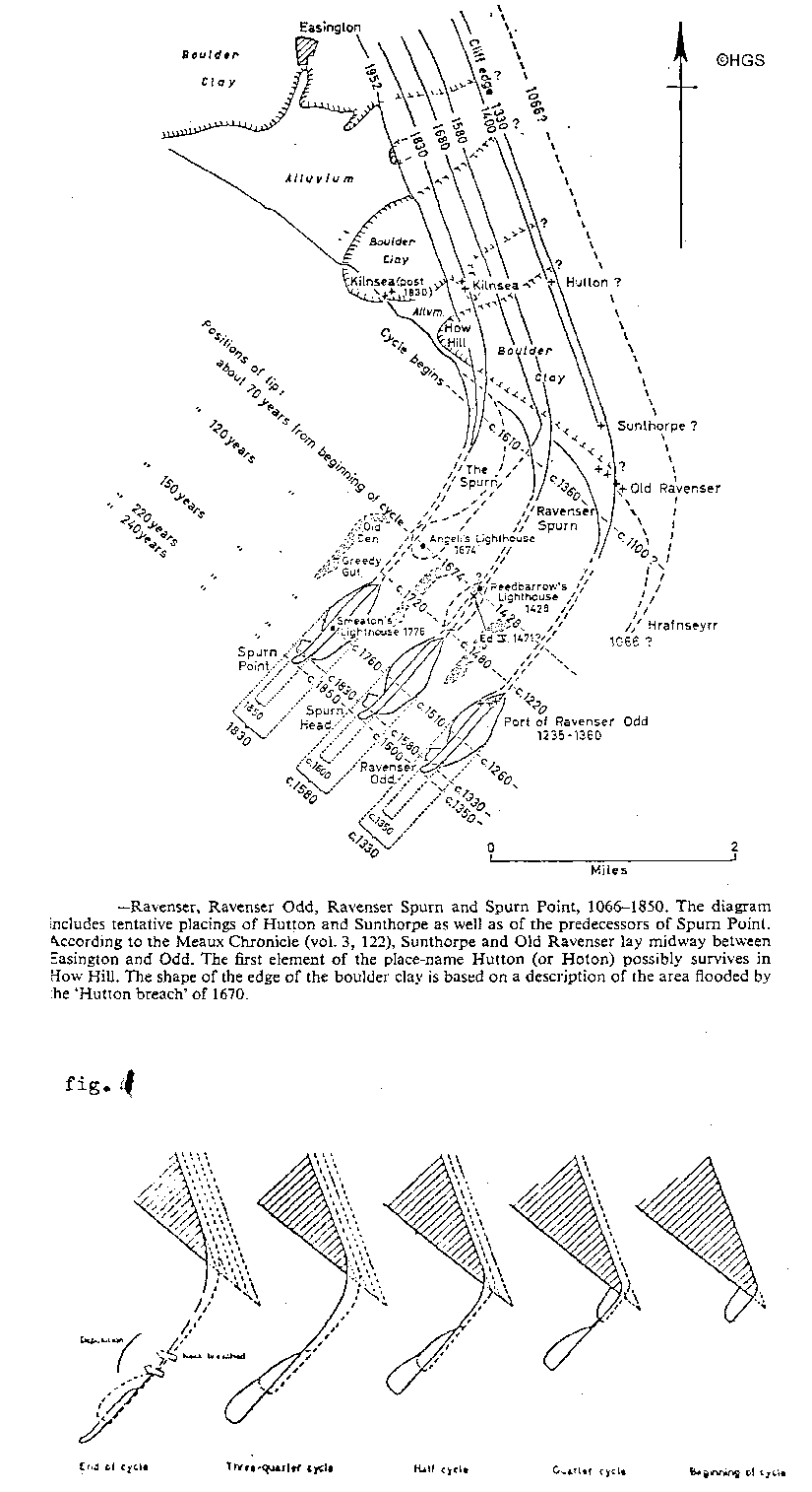 However, the clay material washed out is not totally lost to the sea; some of it is re-deposited on the Lincolnshire coast and some of it forms the Spurn Peninsula. The Spurn Peninsula has an interesting history. It is currently being eroded and there will be a breaching of the spit; the tip of Spurn will become an island once again, as it has done many times in the past. George de Boer has made a detailed study of it and has produced a very detailed plan of the 250 years cycle he believes the peninsula goes through, and the possible locations of the previous spits (see fig. 1). He clearly shows that with each cycle the peninsula progresses westward. De Boer (1964) and English (1991) suggest that when the material that forms the spit at the Humber mouth grows too large for the mouth to support, the pressure of the water from the river and the wave action of the North Sea become too great for the loosely bonded material to hold back the incoming tides which eventually breach it.