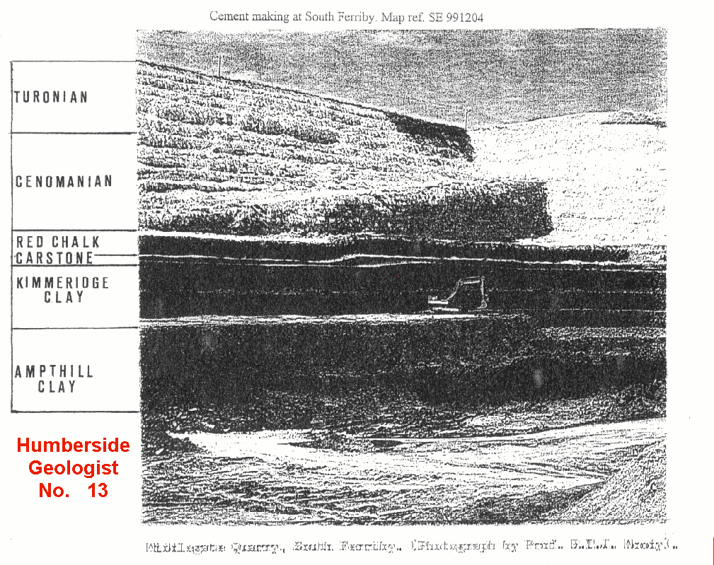 My own experience with South Ferriby quarry dates back to the early 1950s before the works and quarry was taken over by Rugby Cement in 1962 and of course long before the Humber Bridge was built which meant a long journey from Hull via Goole. Eastwoods Humber Cement, the previous owners, first started operations in 1938 and in those days chalk was dug by hand and transported to the works from Middlegate Lane by overhead bucket container over a distance of 1.5 km. Clay, mostly Boulder Clay, was extracted from pits behind the works and moved via a narrow gauge railway system. At that time the first excavation of chalk was from the flinty part of the Turonian lower Terebratulina lata Zone and later from the flintless Mytiloides labiatus Zone, subsequently penetrating about 22 metres of Cenomanian, flint-free, mostly greyish chalk.