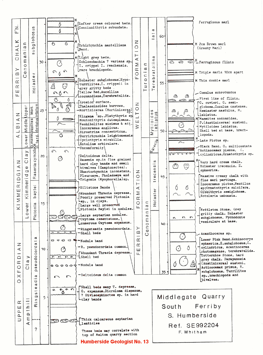 Varying quarry operations at different horizons over a period of many years has enabled the writer to log the succession in considerable detail and at the same time collect and record fossil horizons (see enclosed Figure and list of fossils). A full report was first published in Humberside Geologist No. 10 1992, from which further more detailed information can be obtained.