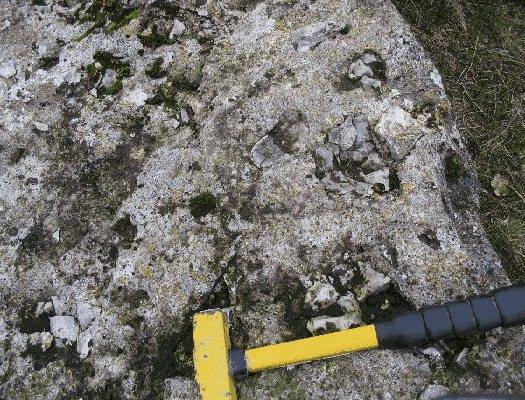 They comprise two large stones separated by a widened joint, and two small stones slightly higher up the valley side: a fallen block lies near the base of the valley slope (Fig.6). The exposure extends vertically for about 10 m and covers an area of about 600 m2. The stones are formed of breccia almost identical with that of St Austin’s Rock in the nature and size of the fragments and the cement (Fig. 7). The bedded nature of the rock is however much clearer and shows a gently concave (catenary) form (Fig.8). The breccia also extends into the field above the exposure as a linear feature according to Mortimer (1885, p.38).