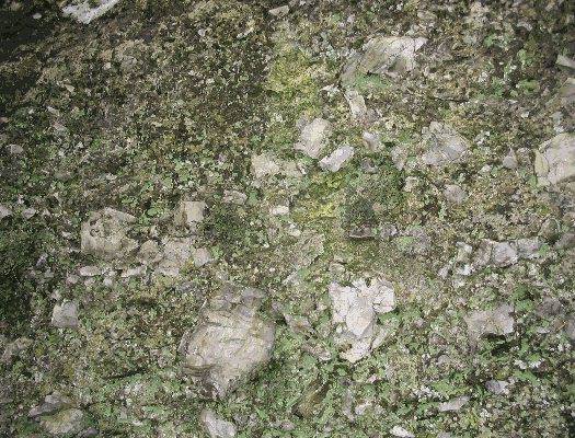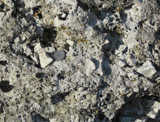 It is a breccia of angular flint and hard chalk cemented with calcite. The fragments vary in size from a few millimetres to about 20cm across; the larger fragments are of flint (Figs. 2-3). Bedding is obscure but some horizontal banding is evident (Figs.4-5). The cement consists of well-formed acicular crystals of sparry calcite up to 1 mm long which fringe the angular fragments, joining them together in places but not filling all the voids.