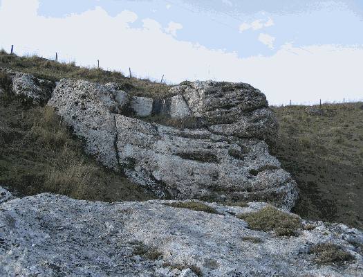 This rock lies at 130m above OD at the head of a typical dry valley, Austin’s Dale [SE 933 344] and pierces vertically the steep valley side. About 6m is exposed in vertical section and the rock covers about 300 m2 although it is currently considerably overgrown with brambles. Fallen blocks lie on the wooded slope below and pieces of the same rock type occur in the field above the exposure.