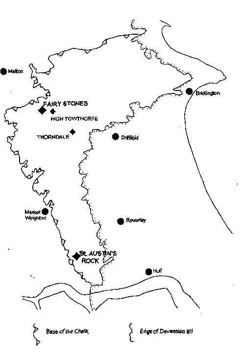 Prominent natural objects which do not conform to the general landscape are often imbued with magic or religious significance. This is the case with the hard, craggy rock masses, known as St. Austin’s Rock and the Fairy Stones, which contrast with the smooth rounded chalk topography of the Yorkshire Wolds. St Augustine is purported to have preached from St. Austin’s Rock and, according to legend, at midnight at the Fairy Stones one’s true love will appear in a vision (Cole 1883).