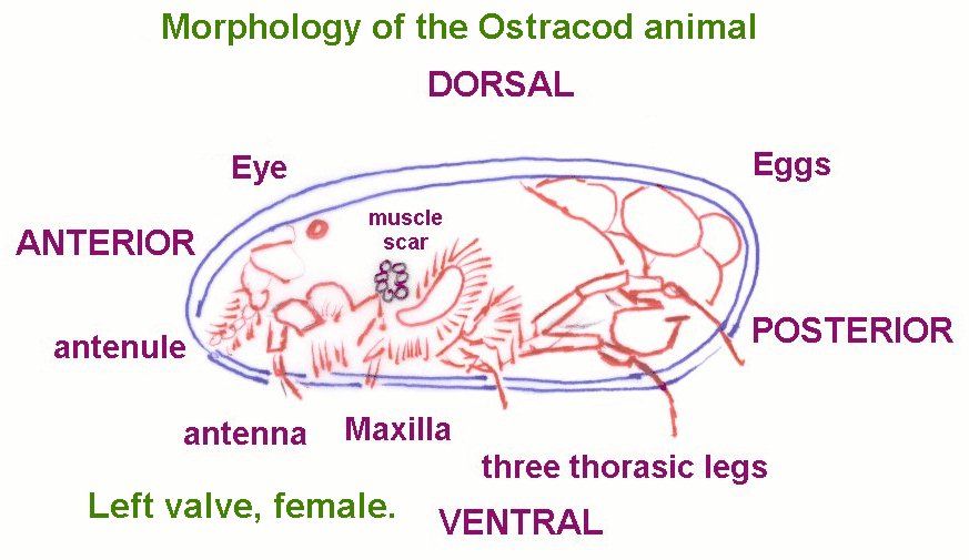 Ostracoda or ostracods or ostracodes are crustaceans like crabs and lobsters. The animal has 7 pairs of appendages, specialized for different tasks. The animal lives inside a carapace made of two valves. They shed the carapace seven times during life growing a new larger one each time. They are sexually dimorphic - males and females are different shapes.