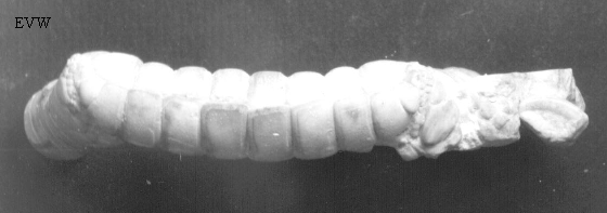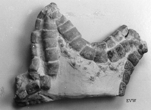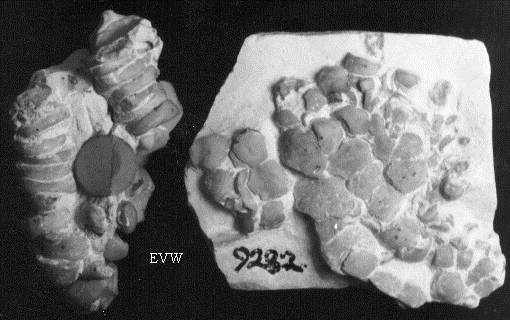 The Danes Dyke - Sewerby section did, however, yield two specimens which provided an opportunity for some original work, one with dramatic results. Each was found as a jumbled mass of ossicles plainly of a single individual and we decided that a more informative "specimen" would emerge if they were separated from their matrix and reassembled in their correct places. By this time we could recognise with confidence from the articular surfaces which plate fitted next to which and into part of the arc or arm. The first attempt was made with the simple "jigsaw-puzzle" represented by a piece of Metopater uncatus of which little more than one side was present (Plate 2, no. 2); but it was useful practice. The second, similar jumble was much more extensive than the first and more difficult. It is a usual characteristic in the genus Metopaster to which this seemed to belong that the several terminal inferomarginals, up to five in number at the points of the star, are matched in the superomarginal series by single "fused" ossicles as can be seen in Plate 2, no. 2 or the side view of the M. parkinsoni in Plate 1, nos. 2b. The supero- and infero-marginalia can easily be distinguished from each other by their profiles. When we came to separate and clean the Sewerby specimen we were surprised to find that there were no "fused", terminal supero-marginals but separate, matching ossicles of decreasing size in both the upper and lower rows. We could tell from the articular surfaces how many median marginals there had been in each of the five sides. From the original jumble there eventually emerged the shape of a nearly complete starfish, not only with the "unfused" supero-marginals at the corners, but also with these appearing to be permanently upturned so that they were more than twice the height of the rest of the disc. We named the Sewerby specimen (Wright and Wright 1940) after Robert Stainforth who had found a fragmentary, articulated example which supported our reconstruction. At the time we placed the new species in Metopaster; but a few years after, Brunnich Nielsen (1943) described a new genus, Recurvaster, for later Danish specimens also with the characteristic upturned arms and our species should be referred to that genus of which much fine material is now known from the Continent (Rasmussen 1950; Schulz & Weitschat 1975), again fully confirming the soundness of our reconstruction of the Sewerby specimen (Plate 2, no. 3 a & 3 b).