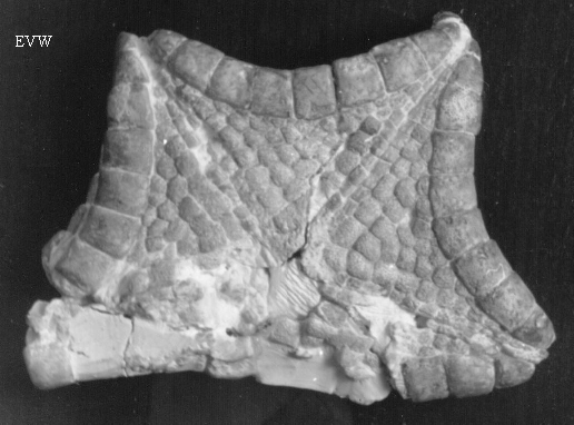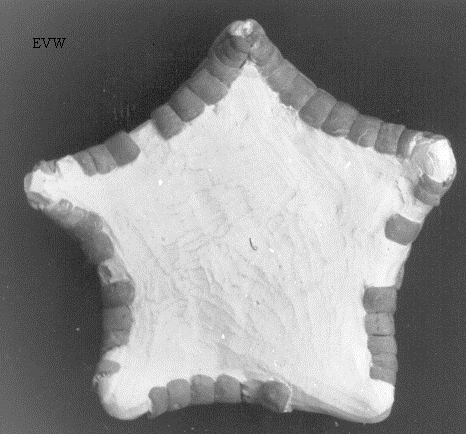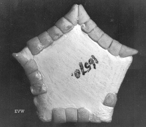 When it comes to the Cretaceous asteroids, it was the pioneering work of W.E. Spencer himself which made their identification a relatively simple exercise (Spencer 1913). Spencer was an Inspector of Schools and amateur palaeontologist who became the world authority on fossil starfish. He recognised that in the majority of genera of Pentagonasteridae the marginal ossicles, which form a substantial border surrounding the pentagonal, central area are generically and specifically distinct. As these ossicles are more usually found in our Cretaceous deposits separated from each other, he developed a simple and reliable method of identifying them even in the field. In the 1930's we were able to find and identify most of Spencer's species up and down the country, nearly all from separated marginal ossicles. In addition to the four articulated specimens from the Flamborough chalk mentioned above, we had a number of other articulated fragments from southern counties.