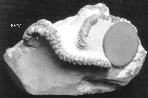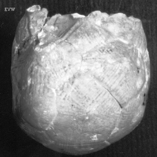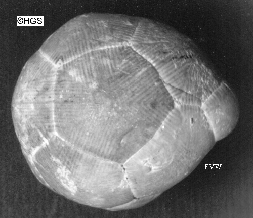 In the collection, however, is one beautifully preserved sac of M. testuditiarius which is quite undistorted (Plate 2, no. 1 a & 1 b) and includes the cover-plates of the opening. It is also interesting for a single, anomalous, extra plate protruding from the otherwise symmetrical base. This was found at Beverley by D.W. Toyne, an assiduous collector and member of the H.G.S. He was of the Hull seedsman family and his fossils came our way in the late 1930's from R.M. Stainforth to whom they had passed when Toyne was killed in a rnotor-cycling accident. The examples from inland are generally much less heavily ornamented than the coastal specimens.