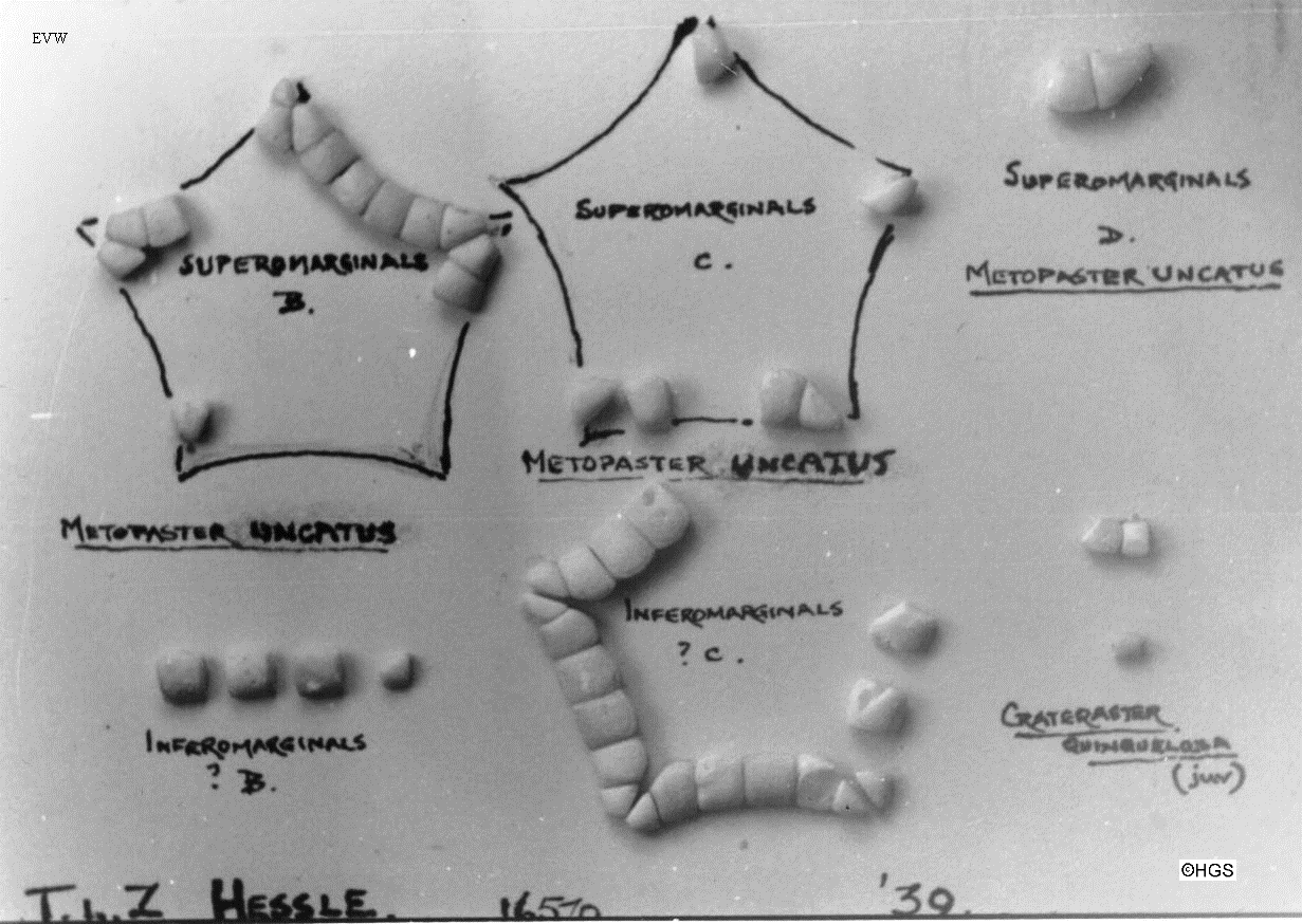 The final episode in the story of "Starfish-building" concerns an amorphous mass of very small starfish ossicles from the Turonian chalk at Hessle which we had found in 1939 and tentatively ascribed to the genus Valettaster known from the south of England. One of us was not satisfied with this identification and, having the time and in those days manual dexterity, removed all the ossicles from the matrix which was hard even by Yorkshire standards. They ranged in size from about 2 to 4 millimetres in breadth and when cleaned turned out to be the remains of several individuals; of two species of Metopaster and three marginals of a Craterasterquinqueloba. Clearly we had another "pellet" on our hands! A number of the ossicles identifiable as M. parkinyoni were plainly of one individual and there were enough to make up a nice little starfish about 17mm along one side of the pentagon (Plate 2, no. 5). The rest of the Metopaster ossicles were typical of Muncatus and judging by their size probably from three individuals. Unfortunately there were not enough of each to restore the originals with as much confidence as in the case of the M. parkinsoni, but they could be mounted in the correct order of upper and lower rows (Plate 2, no. 6). The three Crateraster plates, two supero- and one infero-marginal, were too few for an attempt at reconstruction.